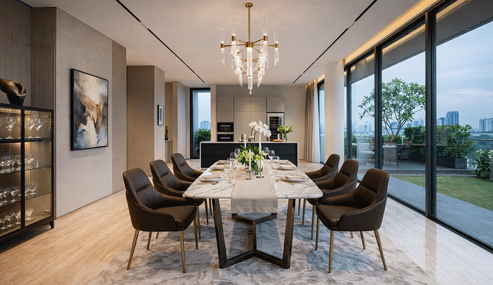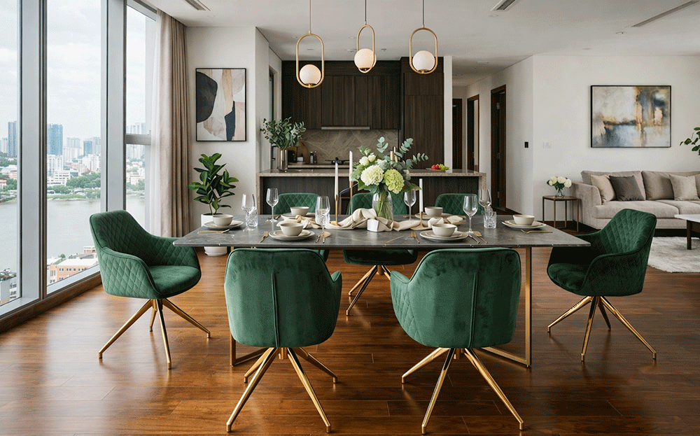 Ghế ăn hiện đại chuẩn gu sẽ dễ dàng kết hợp với bàn ăn, đèn, sàn, và các vật dụng trang trí khác, giúp căn phòng trở nên đồng bộ, sang trọng và thời thượng.