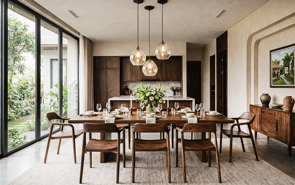 Phòng ăn, phòng khách hoặc không gian nghỉ dưỡng mang hơi thở nhiệt đới.